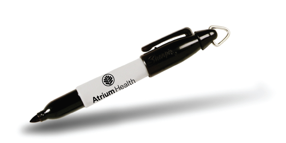 The ever classic Sharpie marker in a portable pocket size! Black permanent marker with a black Atrium Health logo. Great for attaching to clothing, clip boards, or keeping in your pocket!