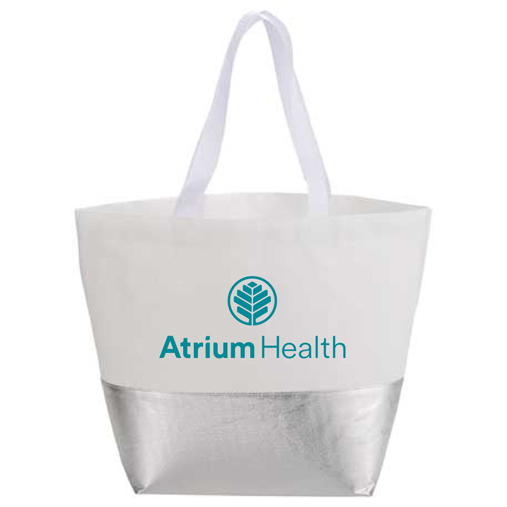 Large open main compartment shopping tote is accented with a metallic bottom panel. Webbed carry handles.